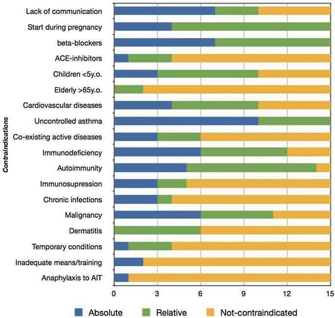 An extended review of the literature regarding contraindications to AIT for respiratory allergy and venom hypersensitivity was performed. Furthermore, Societies and Academies registered in the World Allergy Organization and EAACI databases, were asked for additional information. Only AIT guidelines published under official auspicies were included. A large heterogeneity among the various recommendations on contraindications was registered. Common contraindications to most of the guidelines were: lack of adherence, pregnancy before the start of AIT, the use of beta-blockers, certain age groups, uncontrolled asthma, autoimmune diseases and malignancies.