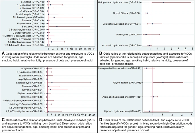 | Adjusted odds ratios (OR) and confidence interval of the relationship between respiratory health and exposure to Volatile Organic Compounds (VOCs) in the living room |