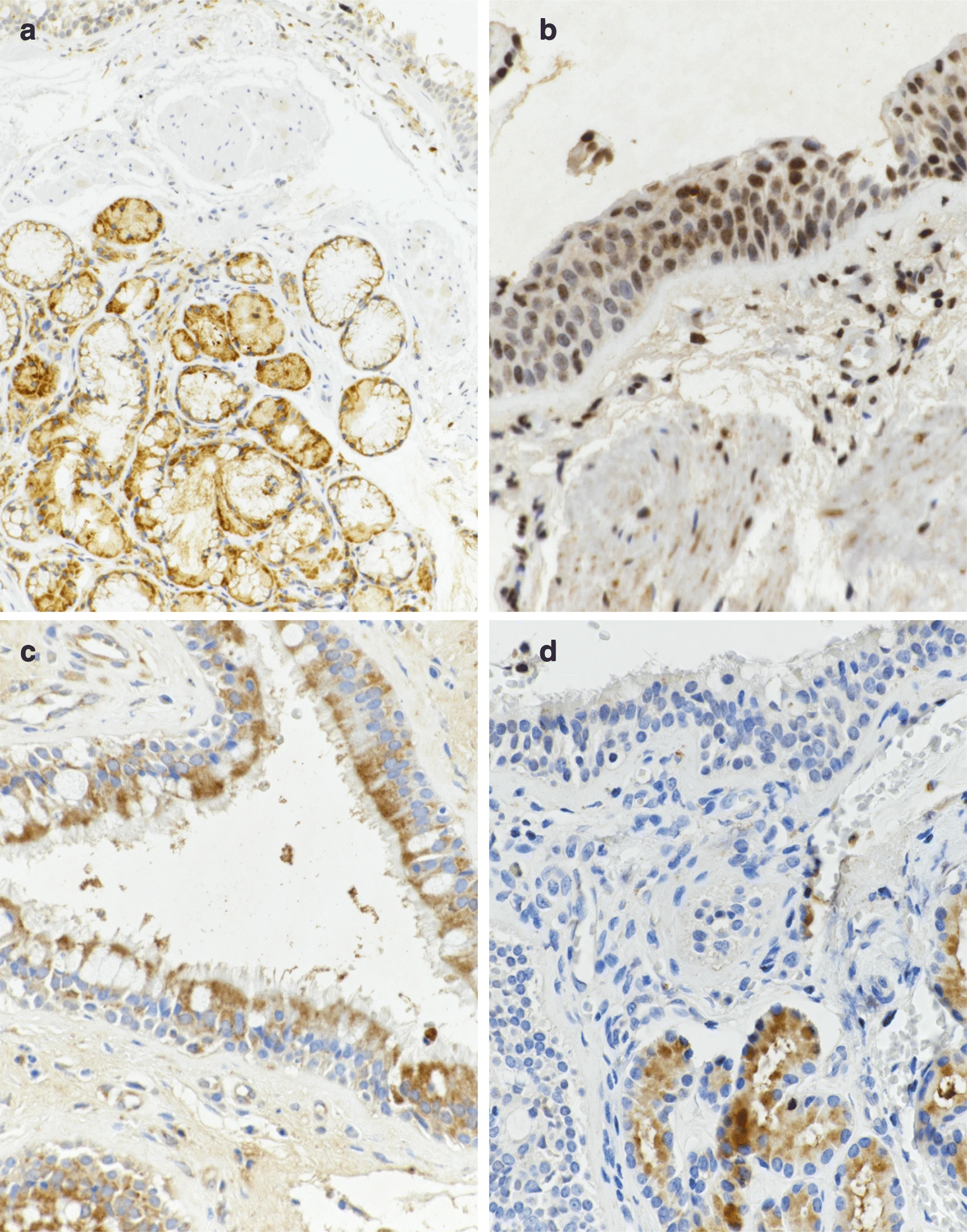 We observed a stronger expression of 5-LOX and in submucosal glands of nasal and bronchial tissue compared to epithelial expression. The expression of COX-1 and COX-2 was stronger in epithelia compared to submucosal glands. There was a similar expression of the enzymes and between upper and lower airways in all patient groups. We did not detect any significant differences between the patient groups.