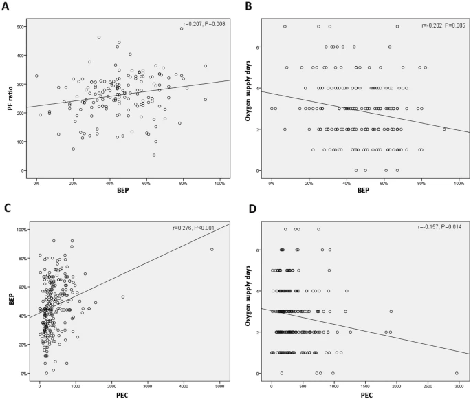 (a) PaO2/FiO2 and BEP; (b) oxygen supply days and BEP;