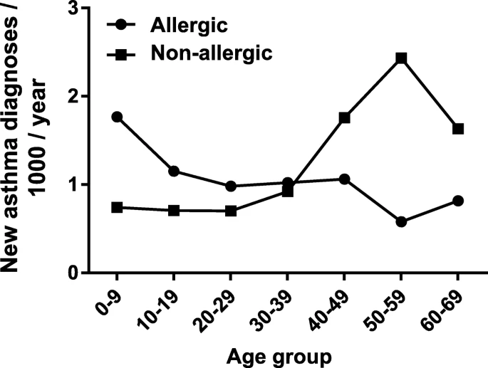 The incidence of allergic asthma is highest in early childhood and steadily decreases with advancing age, while the incidence of non-allergic asthma is low until it peaks in late adulthood. After approximately 40 years of age, most of the new cases of asthma are non-allergic.