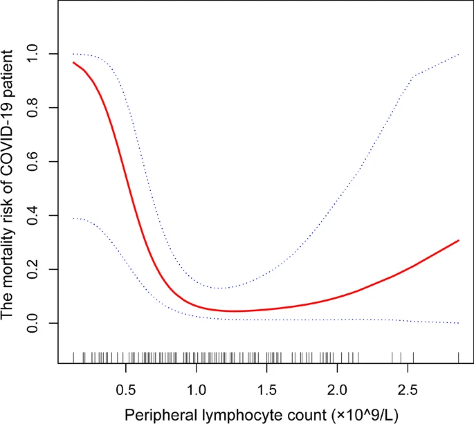 To explore the relationship between peripheral lymphocyte counts (PLCs) and the mortality risk of coronavirus disease 2019 (COVID-19), as well as the potential of PLC for predicting COVID-19 hospitalized patients death.
