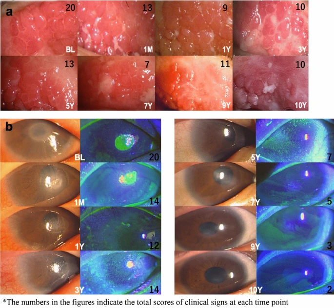The severity of 10 objective signs, related to the palpebral and bulbar conjunctiva, limbus, and cornea, and intraocular pressure (IOP) were observed at baseline, at 2 weeks, 1, 2, 3, 6, and 12 months after starting treatment, and every 1 year thereafter (average use period: 8.4 ± 2.9 years). Safety was evaluated based on the incidence and severity of adverse events.
