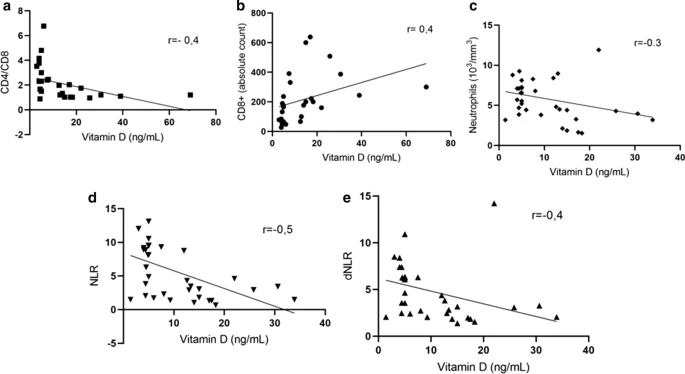 Vitamin D levels were deficient in (80%) of patients, insufficient in (6.5%) and normal in (13.5%). Patients with very low Vitamin D plasma levels had more elevated D-Dimer values, a more elevated B lymphocyte cell count, a reduction of CD8 + T lymphocytes with a low CD4/CD8 ratio, more compromised clinical findings (measured by LIPI and SOFA scores) and thoracic CT scan involvement.