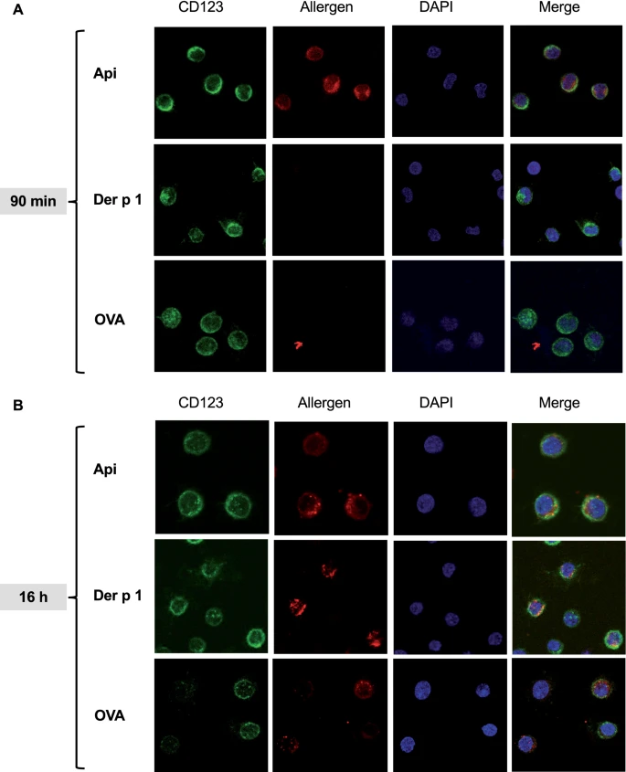 This in vitro study on human pDC isolated from peripheral blood was designed to compare side by side the uptake of three clinically relevant representative allergens: fluorochrome-labeled house dust mite Der p 1, Bee venom extract from Apis mellifera (Api) and the food allergen OVA analyzed flow cytometry and confocal microscopy.