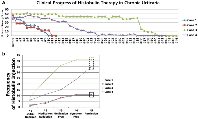 Histobulin™ is not only effective but also induces remission in CSU. The Histobulin™ therapy protocol in CSU may be better if the treatment is continued until remission is achieved. Based on the responses of the patients, early responders and late responders were present. The progression of the disease during treatment consisted of a slow improvement phase and a rapid improvement phase. Uniquely, the appropriate allergy laboratory results, including blood eosinophil fraction, total IgE and eosinophil cationic protein level, were normal in all 4 cases. Further studies concerning the mechanisms of Histobulin™ may be needed.