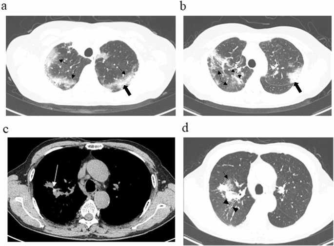 This retrospective cohort study from a single center included 25 outpatients (median age, 65 years) with ABPA diagnosed between April 2015 and March 2019, using criteria proposed by the International Society of Human and Animal Mycology (ISHAM), which focuses on positive specific IgE for Aspergillus fumigatus. Patients were assigned to either the eosinophilic pneumonia (EP) group or Non-EP group, defined according to findings on high-resolution computed tomography (HRCT). The EP group included patients with HRCT findings compatible with CEP; i.e., the presence of peripheral consolidation (p-consolidation) or ground-glass opacities (GGO), with no evidence of high-attenuation mucus. The Non-EP group comprised the remaining patients, who showed classical findings of ABPA such as mucoid impaction. Differences between the groups were analyzed.