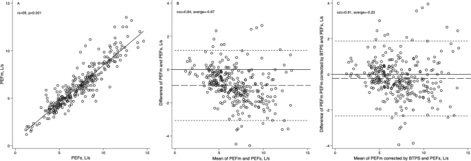 A total of 314 subjects participated, with an average age of 24.3 ± 16.4 years; 59% were Women. The main determinants for the reference equations were age, weight, height and sex at birth. The agreement of the PEFm, PEFs and PIFs values was inconsistent with that reported by other authors, even at the same barometric pressure. The association between PEFm and PEFs was r = 0.91 (p < 0.001), and the correlation coefficient of concordance was 0.84.