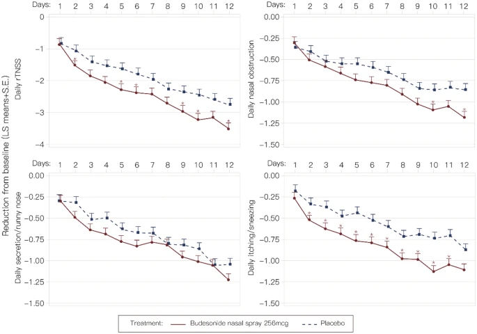 After an interruption by COVID-19, an interim analysis showed that the study could be ended for efficacy with n = 206 participants (103/group) since the primary efficacy endpoint demonstrated significant results. The final efficacy results showed that the 10-day-averaged rTNSS change in the budesonide group was greater than with placebo (− 2.20 vs − 1.72, P = 0.0107). Budesonide also significantly improved 10-day-averaged itching/sneezing change (− 0.75 vs − 0.51, P = 0.0009). Results for SGIC and all other individual symptoms did not show significant differences between the two groups.
