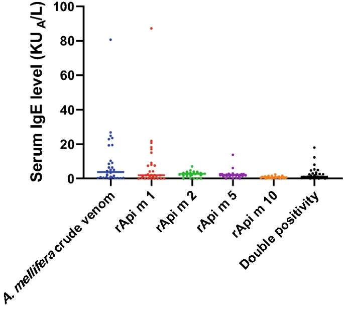 Serum IgE levels to four recombinant allergens of A. mellifera, rApi m 1, 2, 5 and 10 were assessed and compared with serum IgE to the crude venom of A. mellifera or V. vulgaris by Phadia ImmunoCAP, in patients who developed anaphylaxis to A. dorsata stings. Basophil activation in response to venom of A. dorsata or V. affinis was assessed using a passive basophil activation test. Association of the severity of the reaction with basophil activation was compared.