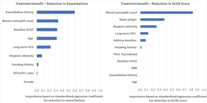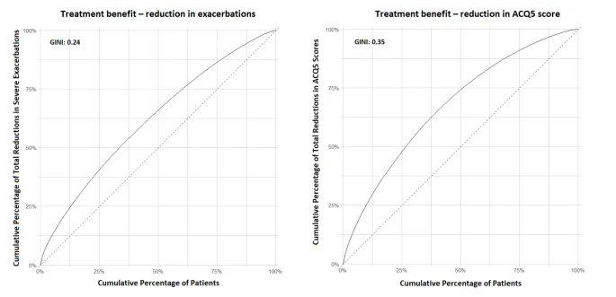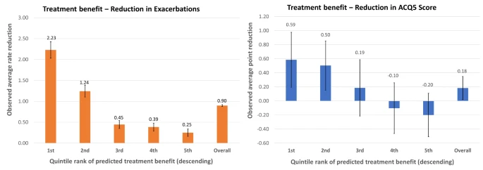 There was marked variability in the ability of patient characteristics to predict treatment response; covariates explained greater heterogeneity in predicting treatment response to asthma control than to exacerbation frequency (Gini index 0.35 v. 0.24). Key predictors for treatment benefit for severe exacerbations included exacerbation history, blood eosinophil count, baseline ACQ5 score and age, and those for symptom control included blood eosinophil count and presence of nasal polyps. Overall, the average reduction in exacerbations was 0.90/year (95%CI, 0.87‒0.92) and average reduction in ACQ5 score was 0.18 (95% CI, 0.02‒0.35). Among the top 20% of patients for predicted treatment benefit, exacerbations were reduced by 2.23/year (95% CI, 2.03‒2.43) and ACQ5 score were reduced by 0.59 (95% CI, 0.19‒0.98). Among the bottom 20% of patients for predicted treatment benefit, exacerbations were reduced by 0.25/year (95% CI, 0.16‒0.34) and ACQ5 by -0.20 (95% CI, -0.51 to 0.11).Conclusion