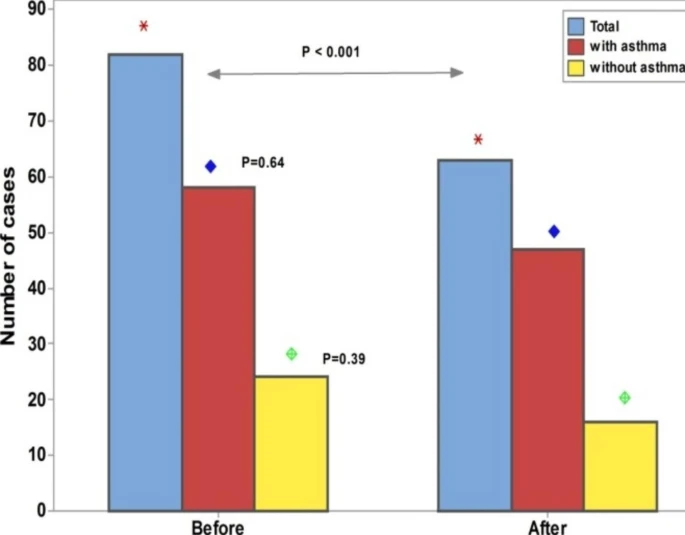 A prospective study was conducted of 166 patients with CRSwNP, with or without asthma. The following variables were collected at baseline and after at least six months of continuous dupilumab therapy; SNOT-22, olfactory symptoms frequency, and ACT score.