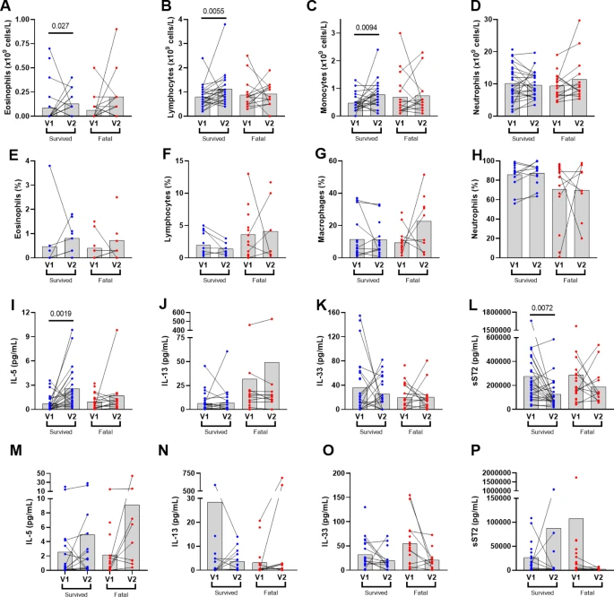 It remains unclear whether eosinophils are directly responsible for this outcome or if they are a biomarker of a Type 2 (T2) response that skews the T1 hyperinflammatory response. This study investigated the airway cellular source of T2 cytokines and levels changes with worsening of COVID-19 in intubated patients...