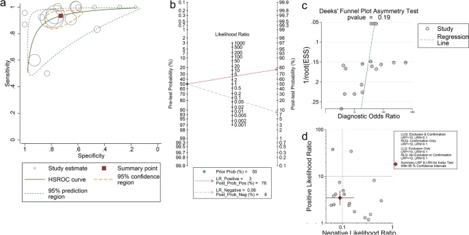 Deeks’ funnel was derived to evaluated the public bias of included studies, and Cochrane Q test and I2 statistic were used to test the heterogeneity.Results