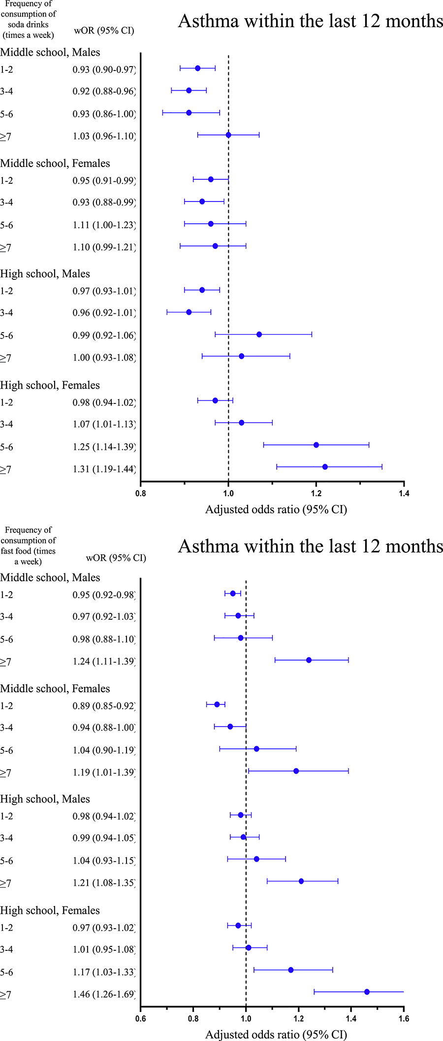 | Adjusted odds ratios for asthma within the 12 months, based on the consumption of soda drinks and fast food. wOR, weighted odds ratio. |