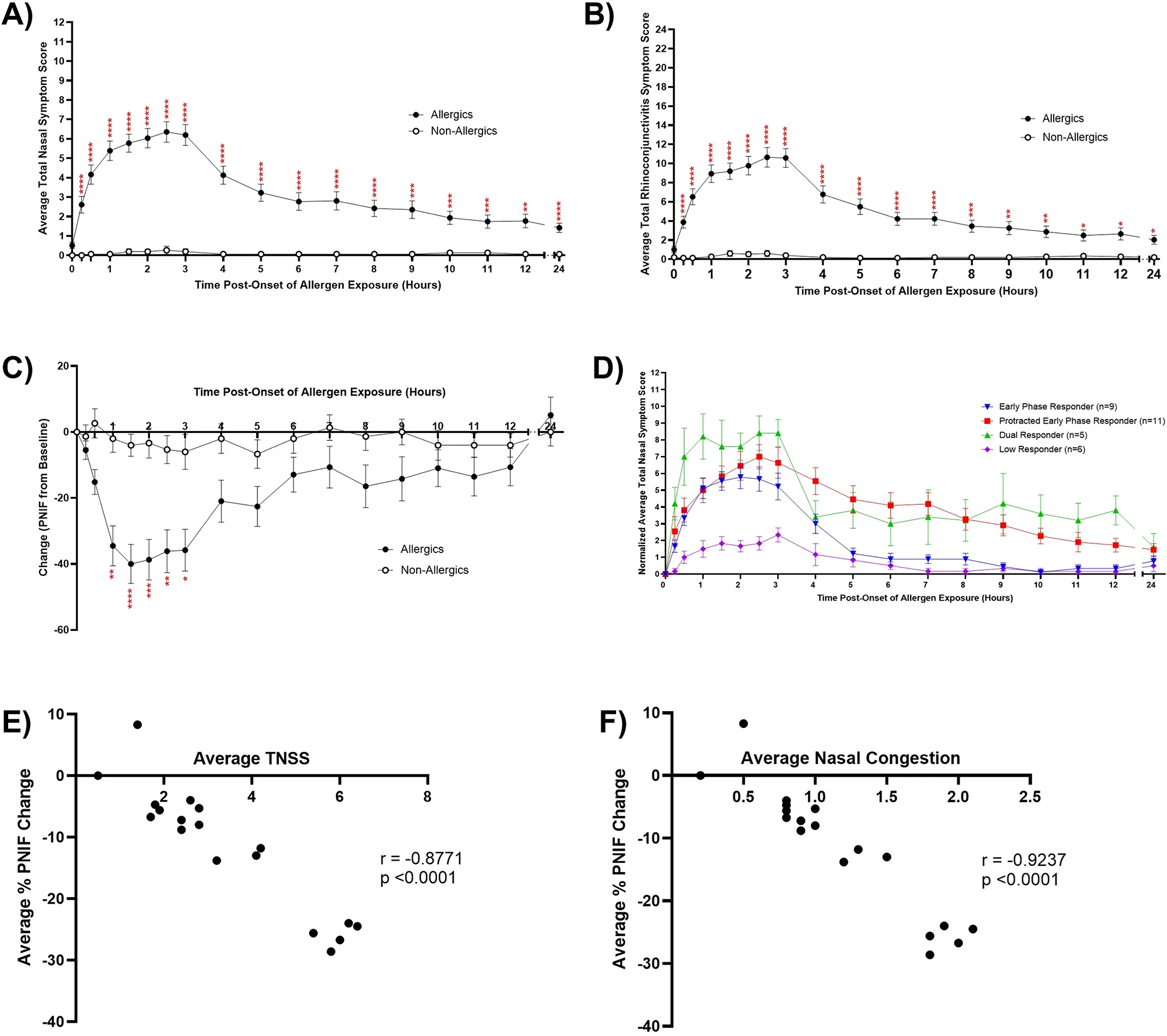 No significant differences in symptom and safety scores were observed between Sessions, hence participants’ data were pooled. Allergic participants experienced significantly elevated (p < 0.05) Total Nasal Symptom Scores and Total Rhinoconjunctivitis Symptom Scores from 15 min to 24-h post-onset of allergen exposure and significantly decreased (p < 0.05) percent change in Peak Nasal Inspiratory Flow from 1 to 3 hours, compared to non-allergic controls. Mean Quality of Life scores were different between phenotypes, unimpacted by whether or not one lived with a cat.