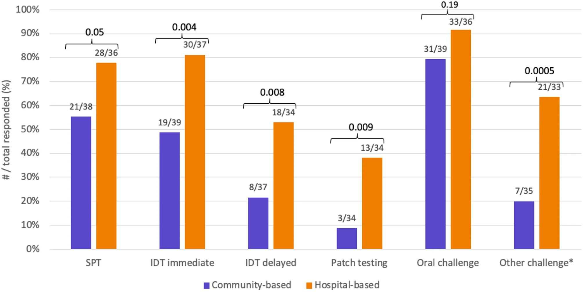 We developed a peer-reviewed 40-item survey, distributed via the Canadian Society of Allergy and Clinical Immunology, to assess practice patterns, testing modalities, and perceived barriers among allergists. Descriptive statistics and Fisher’s exact test were used to evaluate responses by practice setting.