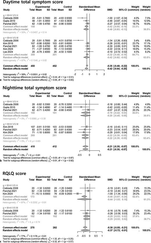 Results: Seven RCTs (n = 887) were included. Combination therapy resulted in greater improvement in daytime symptoms (SMD [95% CI]: −0.42 [–0.64 to −0.20]), rhinorrhea (SMD [95% CI]: −0.69 [–1.09 to −0.30]), and nasal congestion (SMD [95% CI]: −0.64 [–1.05 to −0.24]) compared to monotherapy. RQLQ scores improved modestly overall (SMD [95% CI]: −0.37 [–0.72 to −0.01]), but subgroup analyses showed no significant difference compared to individual agents. TEAE rates were similar across groups (OR [95% CI]: 1.05 [0.57 to 1.94]).