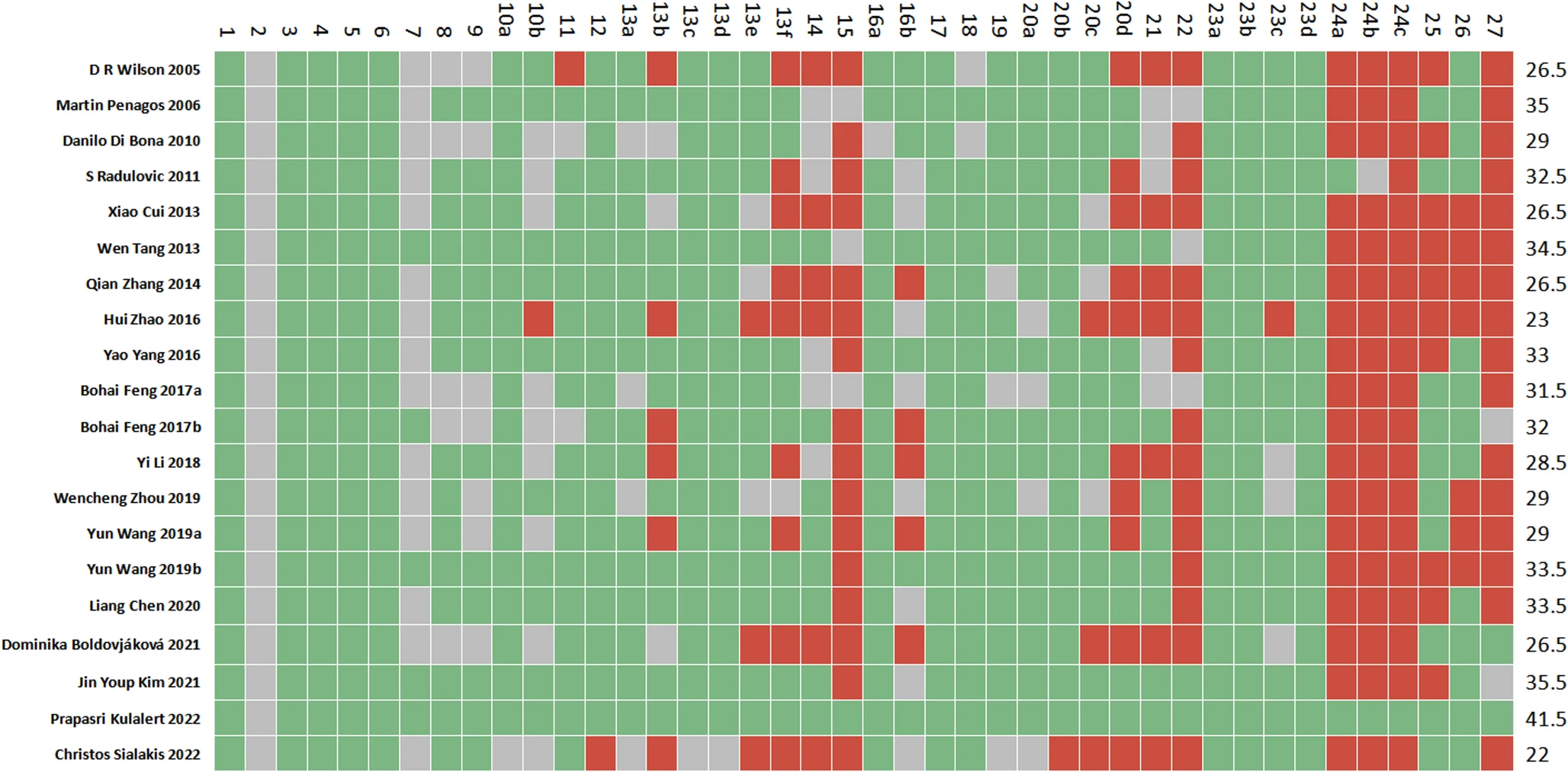 | Cartesian heatmap of the scores of each item in PRISMA 2020. Note: Green indicates compliance; Gray indicates partial compliance; Red indicates non-compliance |
