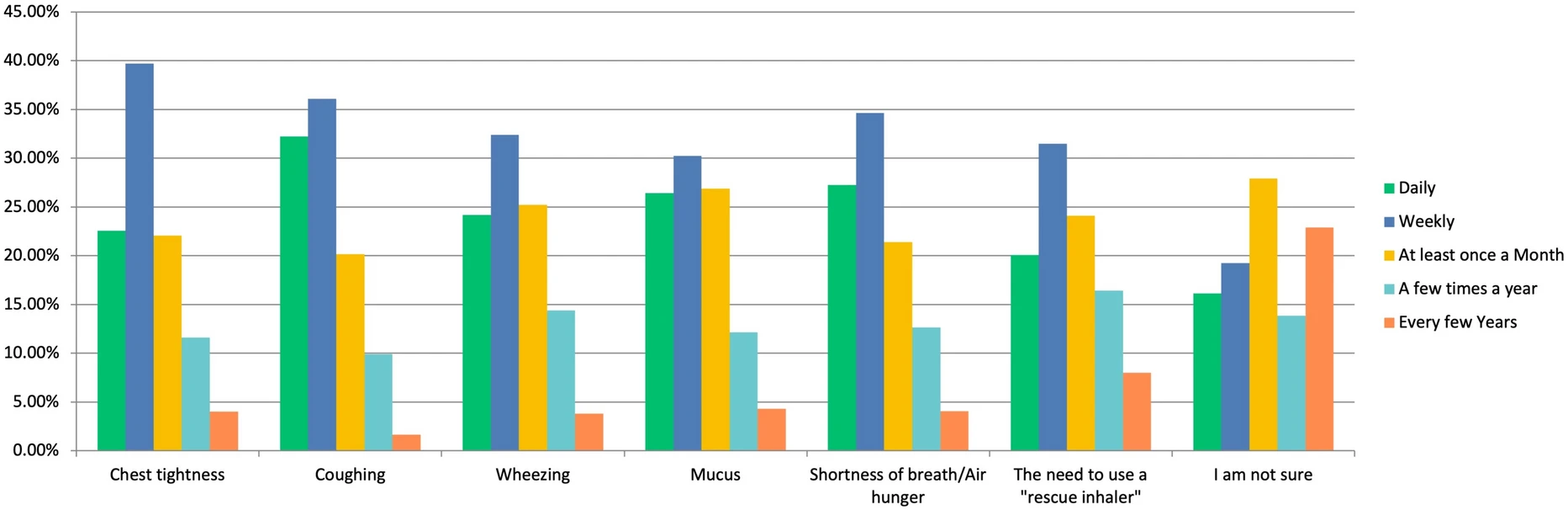 | Respondents’ Symptom Report Self-reported frequency of common asthma symptoms, including cough, shortness of breath, mucus production, wheezing, chest tightness, and rescue inhaler use |