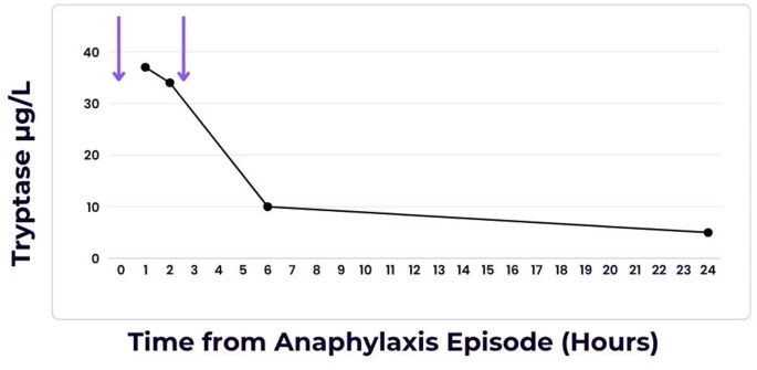 | Serum Tryptase versus Time from Anaphylaxis Episode. Purple arrows represent the two time points at which iodinated contrast media was administered. |
