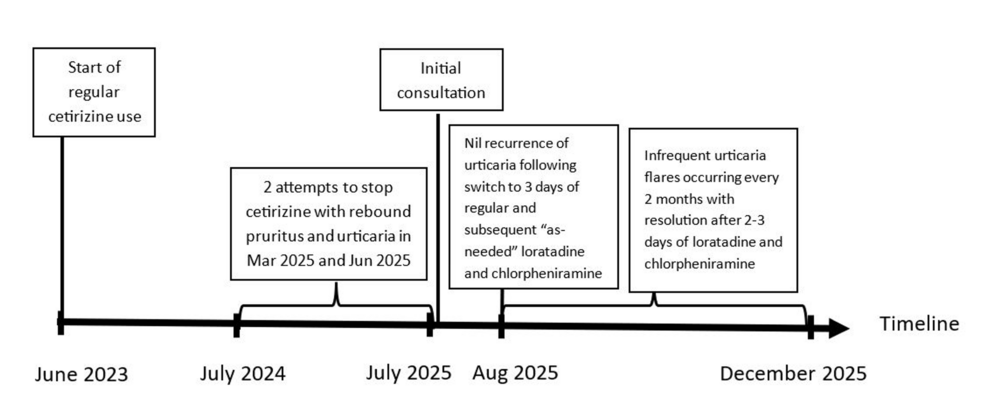 Cetirizine is a common over-the-counter antihistamine used to treat allergic rhinitis, eczema, and urticaria. There have been increasing reports showing increased risk of rebound pruritus following discontinuation of long-term antihistamine use in the United States and the Netherlands. However, evidence on this condition and its management among Asian populations remains limited. We report the case of a Chinese male in his 50s with a background of hypertension, hyperlipidaemia, and chronic urticaria who had been regularly taking over-the-counter cetirizine for the past two years. He presented with recurrent urticaria, characterized by wheals and severe pruritus over his forearms, emerging two to three days after each cetirizine discontinuation attempt. A diagnosis of rebound pruritus and urticaria post-discontinuation of cetirizine was made. Through shared decision-making, he was switched to loratadine and chlorpheniramine for three days before transitioning to an “as-needed” regimen without recurrence of pruritus or urticaria. While the pathophysiology of rebound pruritus and urticaria post-discontinuation of chronic cetirizine use remains poorly understood, this case report suggests that the phenomenon may be drug-specific rather than a class-specific adverse effect. Larger studies are necessary to confirm if a temporary switch and short-term bridging with alternative antihistamines offer a safer discontinuation strategy for patients on chronic cetirizine.Full text