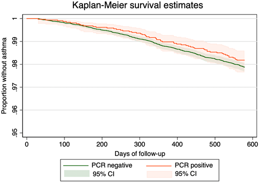 Kaplan-Meier survival curves comparing adjusted asthma-free survival between